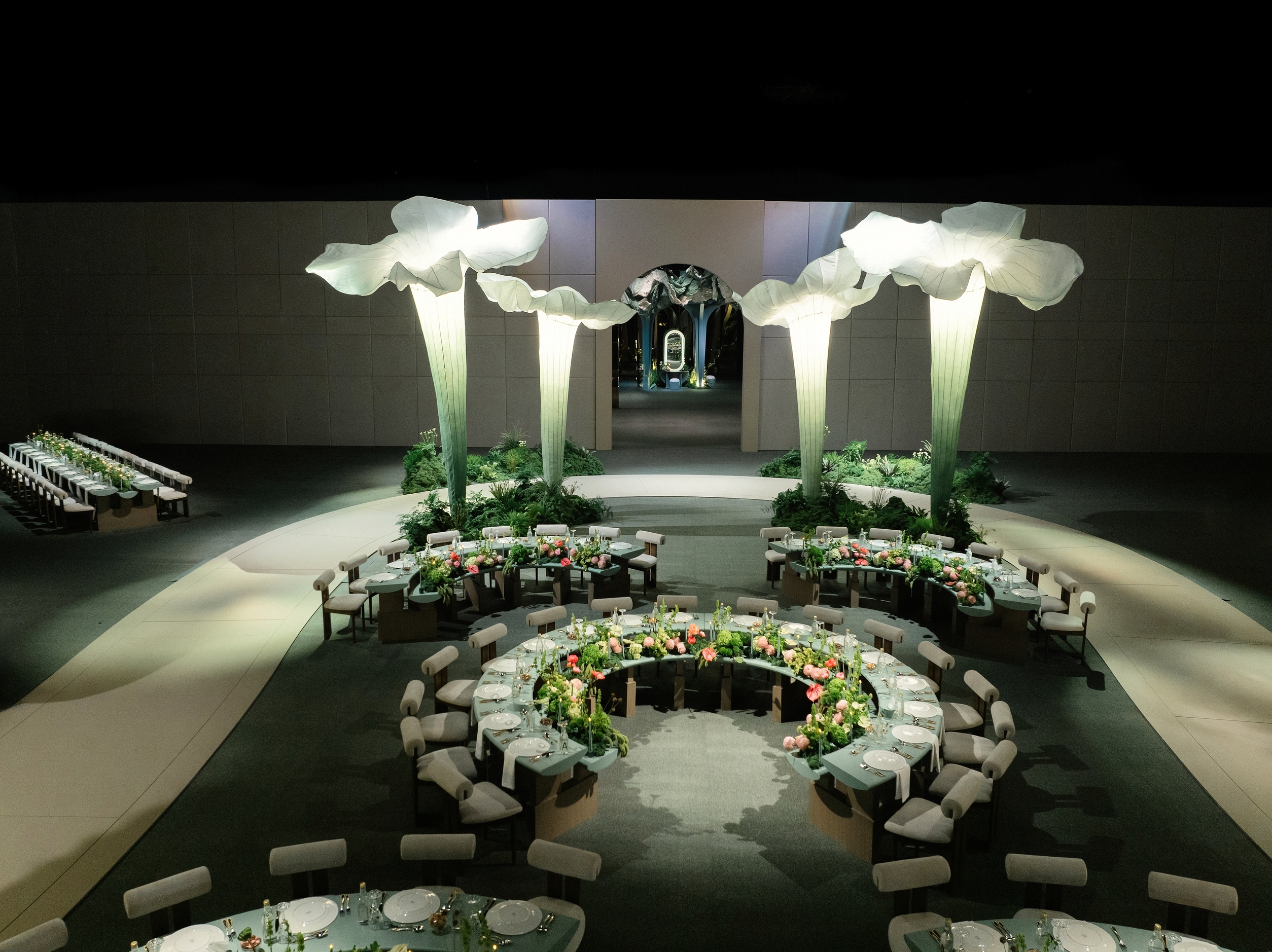 MOD presents Grace Land — a dreamscape where surrealist fantasy meets the serene charm of an English lily pond. Towering, otherworldly structures rise up to 8 metres high, lining a ballroom awash in soft green, mint, blush pink, and a luminous, ethereal glow. From bespoke furniture and handcrafted structures to fresh florals and a polished wooden kosha, Grace Land invites you to step into a world of wonder — where imagination takes form, and beauty knows no bounds.